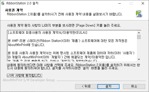 - 사용권에 동의하는 경우에 아래의 체크박스를 체크하고 '설치' 버튼을 선택한다.