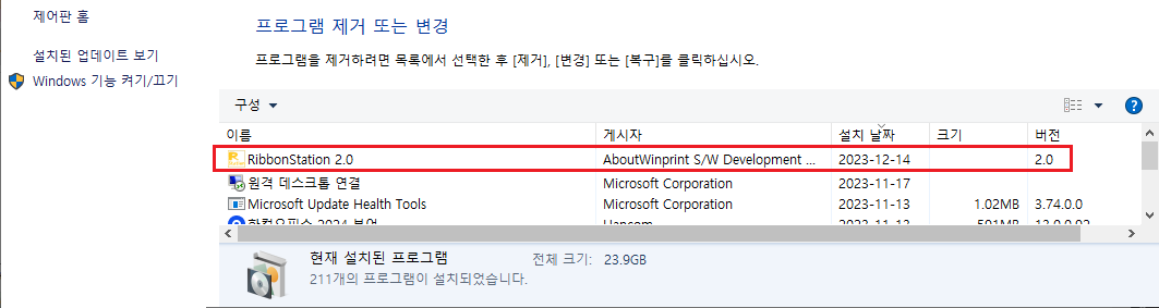 1. 윈도우 메뉴에서 리본스테이션->제거를 선택